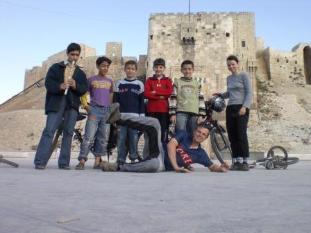 Nach einer Nacht im Zelt unterhalb in einem Kiefernwaeldchen radeln wir am Nachmittag ins quirlige Aleppo, der groessten Stadt Syriens mit etwa 4 Mill. Einwohnern. Fragst Du hier jemand nach irgendwas (Hotel, spezieller Laden, Internetcafe etc) zeigt er Dir nicht etwa nur die Richtung - nein, er bringt Dich hin! (das gilt fuer ganz Syrien) Das Herz dieser alten Metropole bildet die uralte Zitadelle auf einem Huegel. An dessem Fusse befindet sich wohl einer der beruehmtesten , groessten und auch schoensten Souks (weitverzweigter, ueberdachter Basar) auf Erden! Schon bald tauchen wir ein ins Gewirr der Stimmen und Gerueche und lassen uns verzaubern und mitreissen (wortwoertlich) im Gewuehl der Haendler und Kaeufer. Mit Tueten bepackt wie nach einem heimatlichen Weihnachtseinkaufsbummel verlassen wir das andere Ende und traben zum Hotel. Unsere, mit der beruehmten hiesigen Olivenseife, gesaeuberten Koerper bewegen wir am Abend durch die Gassen der geheimnisvollen und geschichtstraechtigen Stadt und fallen zum Absacker in die Sessel der Hotelbar des legendaeren "Le Baron'" Hier sassen bereits Zaza Gabor, Agatha Christie oder Staatsmaenner wie Atatuerk, Charles de Gaulle, Koenig Faisal und vor allem mein Idol Lawrence von Arabien (!!!) der hier wohl ueber den Kampf mit den Arabern gegen das Osmanische Reich bruetete .Ja und nu luemmelt sich im abgewetzten Ledersessel in der immernoch (!) unveraenderten Bar mit franzoesischem Interioer und Flair Andi Wever von Betzdorf. Mit nem kuehlem Tuborg in der Faust brueten wir stattdessen ueber unseren weiteren Routenverlauf.