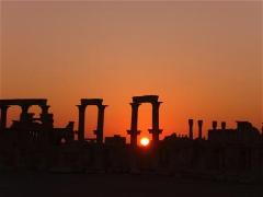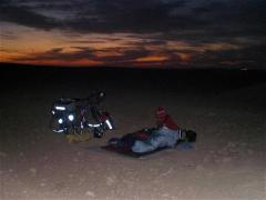 Unser naechstes Ziel ist Palmyra, jenes schoenste Ruinenfeld Syriens - wenn nicht der Welt- inmitten der Wueste. Doch bis dahin erst mal drei Tage eben durch die Wueste. Wir klemmen, was geht, an Wasserpullen und kannister unter die Spanngurte. In diesen Breitengraden verabschiedet sich ab etwa halbfuenf das Tageslicht. Wir campieren immer irgendwo weit abseits der Strasse zwischen Duenen und erleben herrliche glutrote Sonnenuntergangsspektakel, waehrend die Nudeln bereits auf unserem Spirituskocher brodeln. Das Abendprogramm bildet dann das gegenseitige Vorlesen aus unserem extra zur Einstimmung mitgenommen Maerchenbuch "Geschichten aus Tausend und einer Nacht" Doch leider scheint die erbarmungslose Wuestensonne unsere Hirne so matschig gegrillt zu haben, dass sich uns den in sich verschlungenen Geschichten nicht so recht der Zugang oeffnet und wir unter grandiosen Sternenhimmeln in einen bleischweren Schlaf fallen.