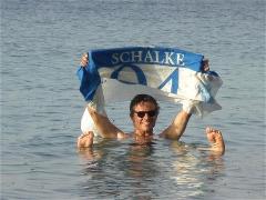 Am naechsten Morgen brettern wir ueber Haarnadelserpentinen in die Tiefe. Dann, entlang am Ufer suedwaerts, bis wir eine gute Stelle finden um reinzuhuepfen ins Paradies fuer Nichtschwimmer. 33% Salzgehalt (Mittelmeer 3,5) machen jedes Abtauchen unmoeglich. Am Abend haben wir schon ein Nachtplaetzchen gefunden als ein Pickup mit aufmontiertem schweren Maschinengewehr und seiner Besatzung uns freundlich aber bestimmt auffordert uns doch ein anderes Nest zu suchen. Die Naehe zu Israel am anderen Ufer macht die Jordanischen Uniformierten hier offenbar doch etwas nervoes.
