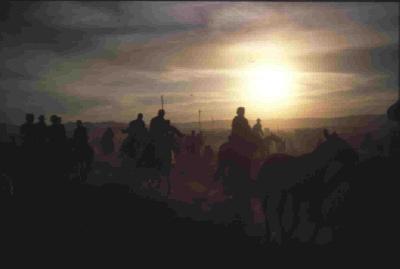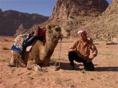 Ueber einen hohen Berggrat geht es dann am naechsten Morgen in ein weites Tal und dann in das Wadi Rum (Wadi = arab. Trockenflussbett). Von diesem Wadi mit seinen Berg und Felsformationen hat Lawrence v. Arabien dermassen in Entzueckung versetzt, dass er beim Durchreiten dieses Tals mit einer Prozession verglich. Schon die ersten steilen Felsriesen taufte er die "Sieben Saeulen der Weisheit"- wie der Titel seines spaeteren Buches und selbst eine Zeitlang den Aufstand vergass. Wie Spritzgusstoertchen erschaffen von einer Riesenhand wirken diese phantastischen Sandsteinfelsen auf Granitsockeln. Es ist irre. Es ist schier unglaublich was die Natur hier mitten in der Wueste durch Erosionen in Jahrmillionen erschaffen hat !!! Im kleinen Dorf Rum tauschen wir Raeder gegen Kamele (nat. nur fuer zwei Tage). Ulli bekommt ein ziemlich durchgeknalltes Viech mit dem er die naechste Zeit nicht warm wurde. Meiner war riesig aber gutmuetig, nur seinen Namen al_Allian, der mich zu sehr an eine bloede Versicherung erinnert, aenderte ich um auf Heiko Westermann.