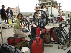 Der Start verlief relativ reibungslos, abgesehen vom ersten Plattfuss am Betzdorfer Bahnhof. Mit der Bahn nach Duesseldorf Flughafen und schwupps spuckt uns der Condor-Jet einige Stunden spaeter im naechtlichen Antalya an der suedtuerkischen Mittelmeerkueste aus. Tagsdarauf noch einmal 14 Std im Nacht-Bus bis wir am Stadtrand von Antakya, unserem Ausgangsort, die Raeder aus den Transportkartons zusammenschrauben und startklar machen. Stadteinwaerts giesst es aus Eimern. Ein Farbenhaendler rettet uns mit Tee in seinem Laden. Schon hier eine etwas andere Welt. Im Basar decken wir uns mit Wasserkannistern, wadenlangen Rock fuer Astrid, Regenschirm (den wir seitdem nicht mehr benoetigten) und weiteren mehr oder weniger wichtigem Klimbim fuer unser orientalisches Radabenteuer ein.