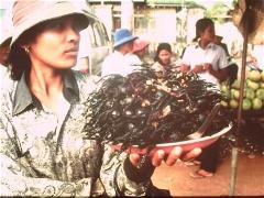 Es ist 5 Uhr Morgens in Can Tho, einer Stadt mitten im Mekongdelta. Hab mir fuer den heutigen Tag ein Boot gemietet um den verzweigten Mekong mit seinen unzaehligen Wasserwegen zu erkunden. Um 5 Uhr morgens haemmert mich mein Steuermann (es ist 'ne zierliche Frau um die 50) aus meinen Hotelbettfedern. Als ob ich betrunken waere, nimmt sie mich an die Hand und fuehrt mich zu ihrem Boetchen, ausgeestattet mit 2 Taktaussenborder mit langer Welle zur Schraube und schmale Paddel. Tolle Stimmung am breiten Strom als die Sonne feurigrot emporsteigt. Und was ist hier nicht schon los zu frueher Stund. Reges Handeln und Feilschen, von Boot zu Boot, auf den "Schwimmenden Maerkten". Wir schippern durch schmale Seitenarme entlang an Pfahlbauten, dann wieder durch verschwenderisch ueppige Vegetation und Mangrovensuempfen. Doch Alles im Allen geht es gemaechlich zu im Delta.
