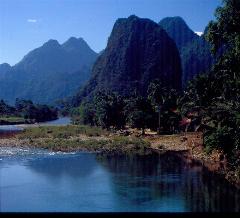 Verlasse Vintiane nordwaerts und erreiche bald huegelige Waldlandschaft. Nach 110 km auf und ab erreiche ich ein idyllisches Fischerdorf an einem großen See mit vielen versprenkelten Inselchen. Tagsdrauf komme ich in Vang Vieng an. Oh welch paradiesisches Plaetzchen zum Abhaengen! Ein beschaulicher Ort, angeschmiegt am Xong Fluss, an dessen gegenüueberliegenden Seite sich bizarre Karstfelsen tuermen – ganz wie in chinesischen Tuschezeichnungen. Was die Laoten hauptsaechlich von Voetnamesen unterscheidet, ist wie sie ihren Tag gestalten. Waehrend die Vietnamesen rund um die Uhr geschaeftigt sind, machen die Laoten eher das, was notwendig ist zu ihren Lebensunterhalt (das ist schon hart genug) und verbringen die andere Zeit damit, angenehm zu leben. Vorsorgende Taetigkeiten haben nicht die Bedeutung wie bei uns. Sie pflegen Kontakte zu Freunden, sie beniessen das Leben.. Und sie sind auch bemueht, wibbeligen Westlern ein wenig ihrer Gelassenheit zukommen zu lassen. So druecken sie Dir ein LKW Schlauch in die Hand, karren dich in einem Tuktuk ein paar Km die Strasse stromaufwärts, damit du gemaechlich dich in dem Schlauch zurueck treiben lassen kannst.damit du kein Durst leidest, wirst du hier und da mit einer Bambusstange ans Ufer gefischt und bekommst ein kaltes Bier zwischen die Schenkel gesteckt. Dann gibt’s ein Stups und du laesst die malerische Bergkulisse weiter an dir vorrueberziehen. Das ganze nennt man „Tubing“ - I love it! Wenn mich nicht kurz vor Vangvieng Strommschnellen durchruckelten und mich fast aus meinem Schlauch befoerderten, waere ich in meinem seeligen Daemmerzustand wohl irgendwann ins offene Meer hinausgetrieben worden – auf Nimmerwiedersehen mit 'ner leeren Buechse Bier in der skelettierten Hand.