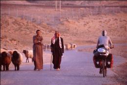 Von Damaskus durchstrample ich braune Wueste bis zum Gebirge des Suweida nach Suedosten in der verwiegend Drusen leben. In Bosra nochmals jede Menge Ruinen aus der Roemerzeit, u. a. das wohl besterhaltenste Amphietheater der Welt mit einem Fassungsvermoegen von 15 000 Menschen. Rueckenwind traegt mich nach Deera. Mein guter Lawrence von Arabien verbrachte hier wohl seine schrecklichste Zeit seines Lebens als er von den Osmanen hier gefangen genommen wurde. Auch ich fand hier wegen mangelhaftester Beschilderung kaum raus. Nach einigen Kilometern ueberquere ich die Grenze. Die Grenzsoldaten begruessen mich herzlich und als sie meinen deutschen Pass sehen, faengt einer an, begeistert Deutsche Fussballclubs aufzuzaehlen. Leider die Falschen. Ich simuliere Wuergen und Erbrechen und halte dem Grenzer, der erstaunt aus runden Kuhaugen glotzt, meine BlauWeisse Fahne aus der Lenkertasche unter die Nase. Ich hoere vom ihm ein nahezu akzentfreies SCHALKE 04 -