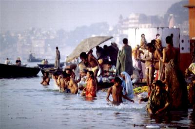 Varanasi - die Stadt des Lichts, die ewige Stadt, der heiligste Ort der Hindus! Varanasi ist fast unbeschreiblich. Lange Treppen , die Ghats, säumen hier die Ufer des Ganges, zu dem Tausende Pilger strömen. Ein rituelles Bad mit einem Schluck aus den Fluten verspricht Verheißung. Nach Varanasi kommen auch unzählige Kranke und Alte, zum Sterben. Welches eine Erlösung vom ewigen Kreislauf der Wiedergeburt bedeutet. Dies dürfte nicht all zu schwierig sein nach ein paar Schlückchen aus der stark verschmutzten Brühe. Wir kommen unverhofft zum richtigen Zeitpunkt. Es ist Diwali. Das größte Fest der Hindus. Es ist wie Weihnachten und Ostern zusammen! Und das erleben wir nun am heiligsten Ort der Hindus. Der Vollmond ist nur noch das Sahnehäubchen. Tausende Ölkerzchen leuchten an den Ufern der bezaubernden Stadt. Tausende Kerzen auch auf kleinen Blätterschiffchen auf dem Ganges soll je einen Wunsch erfüllen. Natürlich schicken auch Anja und ich ein Solches Richtung Indischen Ozean. Mehr und mehr Menschen drängeln sich auf den Ghats. Trommelmusik versetzt die Masse in einen Rausch. Früh am nächsten Morgen, noch vor Sonnenaufgang, rudert uns ein schlaftrunkener Gondelier entlang den Ghats. Der Nebel wabbert noch über dem Wasser, während schon hunderte Pilger ein Bad nehmen oder die Asche ihrer Verstorbenen in die Fluten streuen. Frauen in ihren farbenfrohen Saris und dem Gesicht zur aufgehenden Sonne, heben ihre Hände zum Gruß des Gottes Shiva. Der Kadaver eines Menschen treibt dicht an unserem Boot, aber auch an den Badenden vorbei. Niemand scheint Verwunderung, Anstoß oder Empörung zu empfinden. Alles ist Leben. Alles fließt dahin - ein immerwährender Kreislauf aus Leben und Tod.